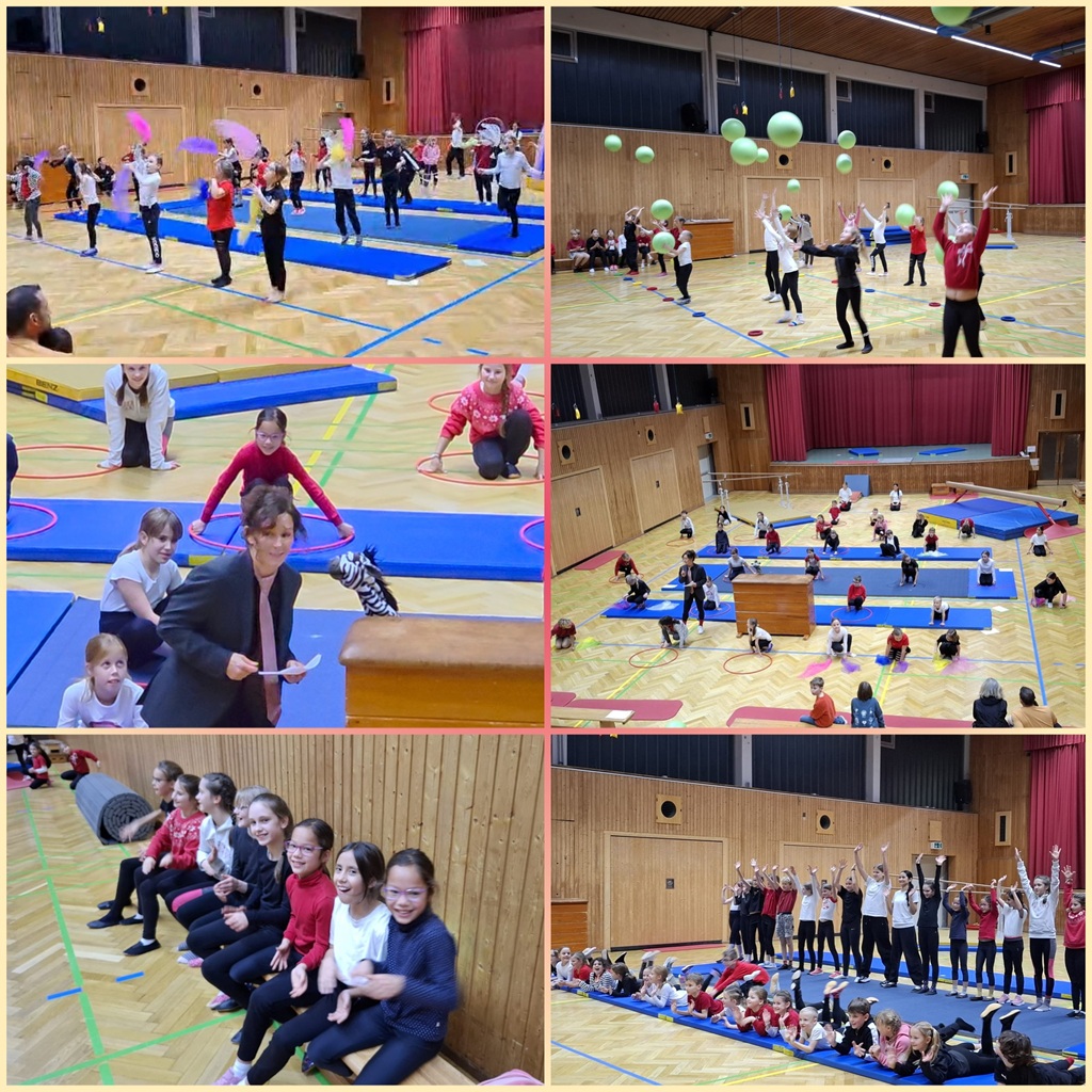Zum Auftakt präsentierten die kleinen und nicht mehr ganz so kleinen Artisten ihre Zirkus-Künste: Seilspringen, Hula-Hoop und Jonglage. Es folgte ein fließendes Bodenturnen an vier parallelen Mattenbahnen mit Rädern, Sprüngen und Handständen, bevor eine Choreografie mit leuchtend grünen Bällen für echte Wow-Effekte sorgte.